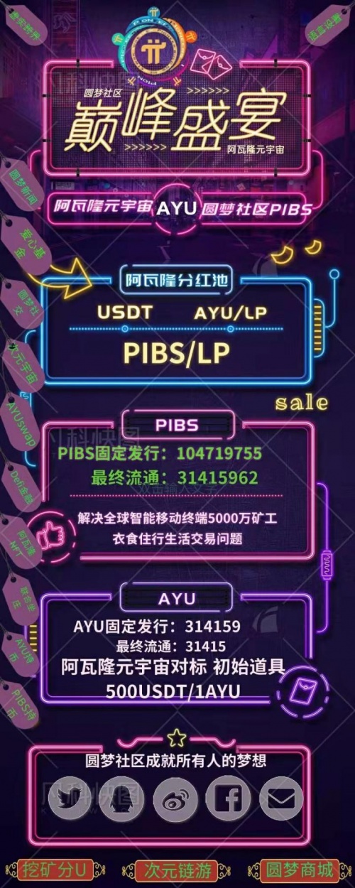 子币:AYU已经上线,固定发行314159枚,释放周期四年,每天释放218枚,凡持有PlBS通证加池子,LP令牌满100个,均可免费获得AYU,无需购买。AYU现在9U左右一枚,游戏和生态落地时,价值对标500U一枚。 全力打造阿瓦隆(世界)元宇宙 (惟一元宇宙门票PIBS),解决全球5000万移动终端矿工衣食住行和生活工作变现问题。