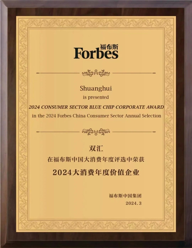 3月8日,福布斯中国携手普华永道、沙利文、中国大消费CXO创新中心在上海环球港凯悦酒店举办了“2024年中国大消费年度盛典”,并发布“2024福布斯中国大消费年度评选”结果。双汇获评福布斯“2024大消费年度价值企业”,双汇发展副总裁周霄代表企业领奖,并参加高峰论坛。
