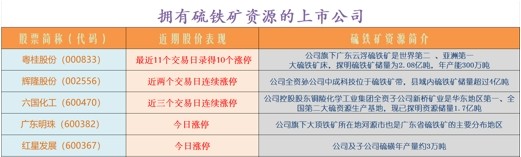 对于A股市场投资机会而言,在粤桂股份(000833)的股价连续涨停的示范效应下,周四A股市场上的硫铁矿概念股再度受到关注,六国化工(600470)、辉隆股份(002556)股价表现突出。那么A股上市公司中还有哪些公司拥有硫铁矿储备资源呢?