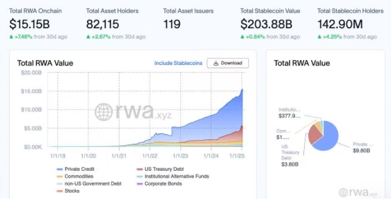 rwa.xyz网站显示RWA 总市场体量逾150亿美元