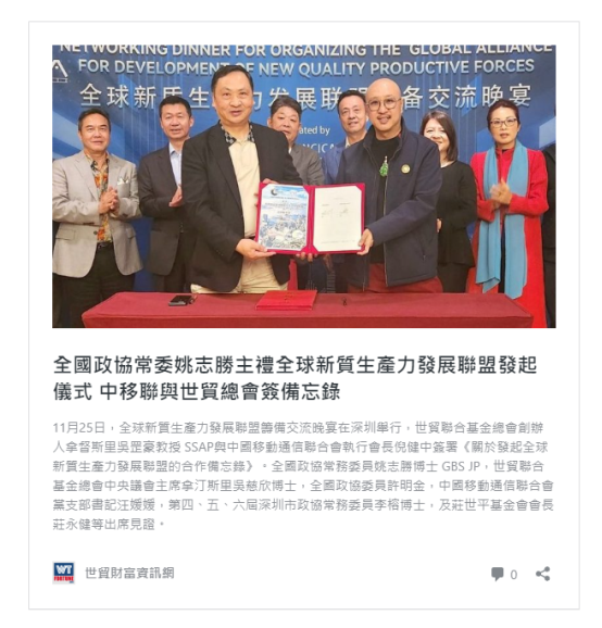 全球新质生产力发展联盟启动RWA代币化加速器,全球新质生产力发联盟共同主席拿汀斯里吴慈欣博士与中关村协同发展投资有限公司粤港澳大湾区董事长王建华签署区域合作协议。全球新质生产力发联盟执行主席拿督斯里吴罡豪教授 SSAP,第十、十一届全国政协常务委员杨孙西博士 GBM JP,第九、十、十一、十二届全国人大代表杨耀忠 SBS JP,中共十九大、二十大代表杜玉涛博士,第十三届全国人大代表、香港区块链协会荣誉主席张俊勇 MH JP等出席见证。