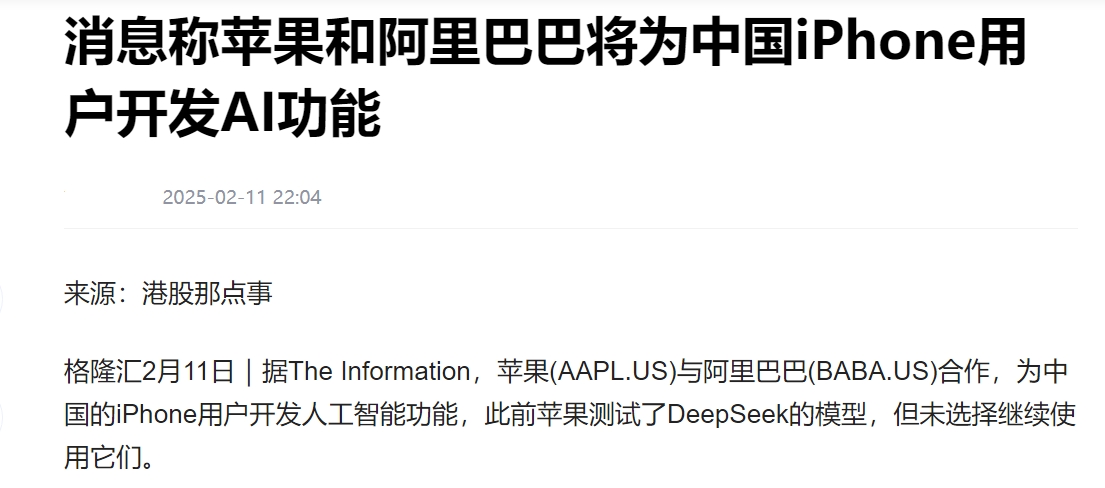 2 月 11 日,外媒《The Information》报道,苹果将与阿里巴巴合作,为中国的 iPhone 用户开发 AI 功能。