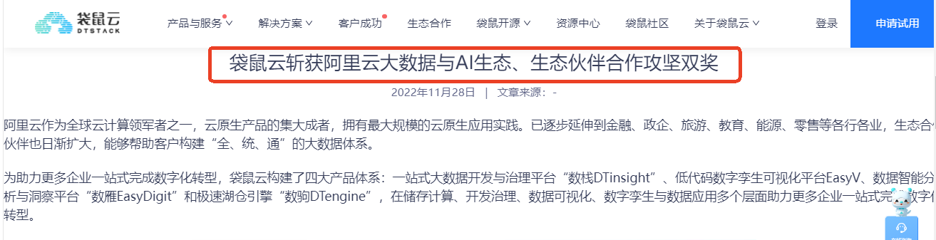 作为行业内领先的全链路数字化技术与服务提供商,从成立以来,袋鼠云一直与阿里云保持着亲密的合作伙伴关系。袋鼠云凭借大数据开发与治理平台、数字孪生和可观测运维等技术能力,以及丰富的落地应用方案,2022年11月,被授予“阿里云产品生态伙伴合作攻坚”奖。