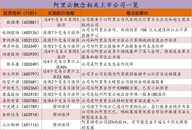 周四A股市场盘面一个最突出的变化就是昨天(周三)表现强势的阿里云概念连续两个交易日上演涨停潮,或已经成功取代DeepSeek概念,成为当前A股市场的热点风口!由于阿里云概念与DeepSeek概念在具体的相关概念股标的上存在明显的交集,因而从昨天的盘面来看,阿里云概念这个板块的走强在某种程度上隐藏在DeepSeek概念身后。不过从今天盘面的涨幅榜来看,随着DeepSeek概念股走势分歧的加大,阿里云概念或开始呈现全面爆发的趋势!事实上,结合消息面来看,2月11日消息,据 The Information 周二援引一位知情人士的话说,阿里巴巴将为中国的 iPhone 用户开发和推出 AI 功能。随后,阿里巴巴董事局主席蔡崇信在今天正式确认了这一消息。从今天的涨幅榜上可以看到,阿里云概念股数据港(603881)、杭钢股份(600126)、梦网科技(002123)、博彦科技(002649)、浙文互联(600986)、视觉中国(000681)、中恒电气(002364)、康盛股份(002418)、居然智家(000785)、宁波建工(601789)、金桥信息(603918)、三江购物(601116)、用友网络(600588)、南威软件(603636)、依米康(300249)、雅达股份(430556)、弘信电子(300657)等多只品种股价封于涨停或涨幅超过10%。种种迹象显示,在苹果公司与阿里合作开发AI功能的利好消息预期下,阿里云概念股或迎来补涨良机。