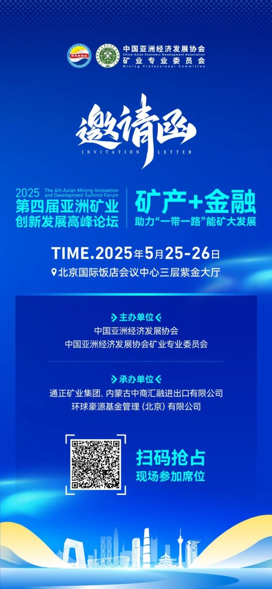 为深化“一带一路”能矿产业国际合作,破解行业投融资瓶颈,推动全产业链融通发展,中国亚洲经济发展协会矿业专业委员会将于2025年5月25日—26日在北京举办第四届亚洲矿业创新发展高峰论坛。本届论坛以“矿产+金融助力‘一带一路’能矿大发展”为主题,旨在通过产融结合推动全球矿业全链条升级,共探“矿产+金融”深度融合的创新路径,为亚洲乃至全球矿业高质量发展注入新动能。