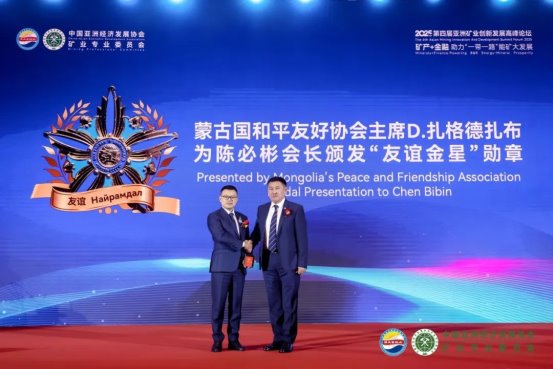 会议期间,蒙古国和平友好协会主席D.扎格德扎布为陈必彬会长颁发“友谊金星”勋章。以表彰陈必彬会长向国内外公众宣传和落实蒙古多支柱、开放的外交政策和活动,为增进蒙古与世界交流合作做出积极贡献,以及会长单位通正矿业集团在陈必彬会长的领导下,为促进蒙古国矿业发展,助力中资项目在蒙落地生根所做的努力。