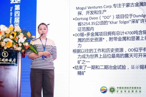 蒙古国土地广阔,矿产资源丰富,目前已探明的有煤、铁、金、铜、萤石等80多种矿产资源,6000多个矿点。蒙古国矿权代表宝乐向参会嘉宾详细介绍了蒙古国东方省金矿、蒙古国中戈壁莫卧儿锡矿、蒙古国肯特肯苏省Sako萤石矿。