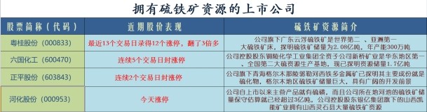 近期,固态电池技术进展明显加速,硫化物技术路线越来越受到市场关注,华为、宁德时代等大厂聚焦硫化物路线标志着硫化物技术路线已经成为当前我国固态电池技术发展的主流方向。在这样的大背景下,近期以粤桂股份(000833)为代表的拥有硫铁矿资源的上市公司受到A股市场资金关注。因此,硫铁矿概念作为整个固态电池板块的核心领涨主线,依然是市场下一步挖掘的主要方向。因此,对于A股市场的投资者而言,挖掘“下一个粤桂股份”,无疑是把握行情主线核心的最好策略。市场人士解析,哪家A股上市所在地的硫铁矿储量更多,这家上市公司或成为资金关注的对象。事实上,从最近涌现出的几只连续涨停的硫铁矿概念股来看,尤其是最近连续5个交易日涨停的六国化工(600470),无疑是从其硫铁矿储量对比粤桂股份(000833)硫铁矿储量的角度来重估其二级市场的估值。